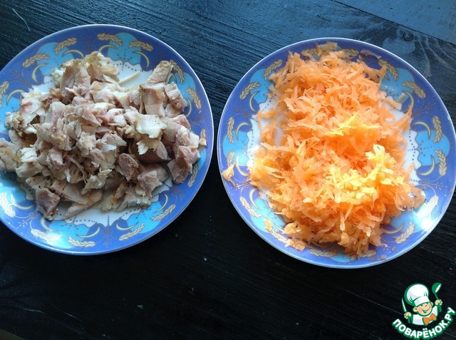 Грудку нарезать маленькими кубиками, сырую морковь натереть на средней терке. В чашке смешать майонез и зубчик чеснока, пропущенного через пресс.