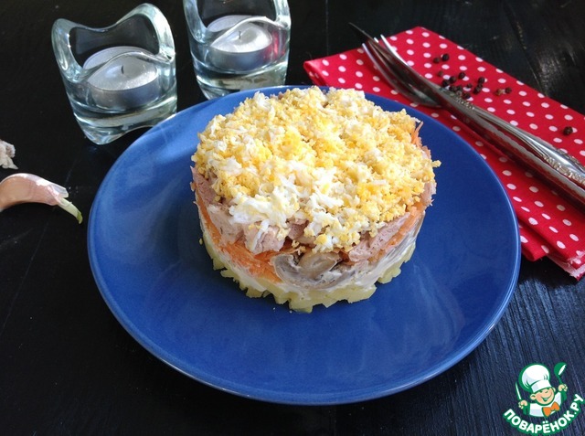 Собрать салат слоями. Сначала выкладываем картофель и смазываем чесночным майонезом, далее грибы с луком. Следующим слоем морковка, смазать майонезом и сверху выложить курочку. Яйца натереть на мелкой терке и выложить сверху. Салат готов!
