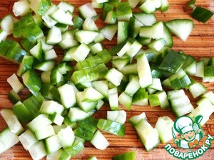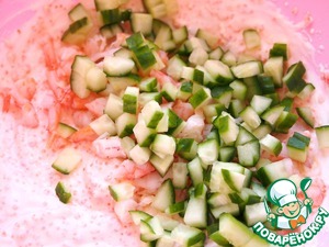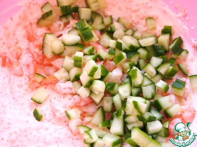 • К творожному сыру добавить икру, креветки и огурец, хорошо перемешать.