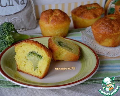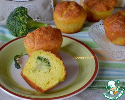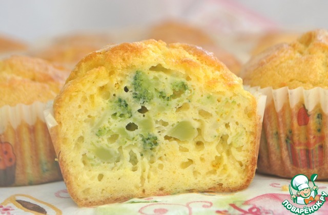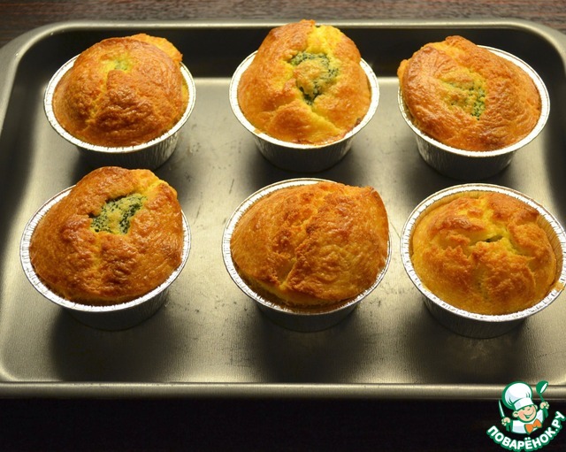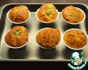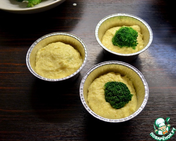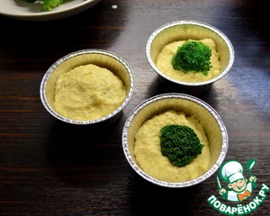 Подготовить формочки для кексов. Смазать их слегка маслом и присыпать манкой. Заполнить каждую формочку наполовину тестом, в центр вставить соцветие брокколи. Добавить сверху еще по ложке теста, чтобы закрыть (спрятать) капусту в тесте.