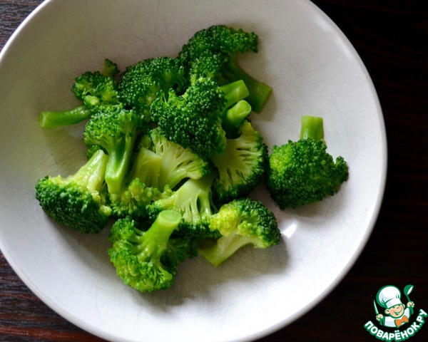 Подготовить первым делом брокколи. Промыть, разделить на средние соцветия. Вскипятить воду с щепоткой соли, положить капусту, подождать, когда вода опять закипит и сразу достать из воды. Ополоснуть холодной водой и обсушить.