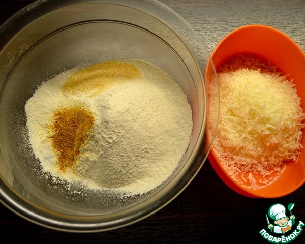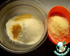 В миску просеять муку, добавить манную крупу, сахар, соль, разрыхлитель и немного шафрана (или куркумы). Натереть на мелкой тёрке сыр и добавить к остальным сухим продуктам, перемешать.