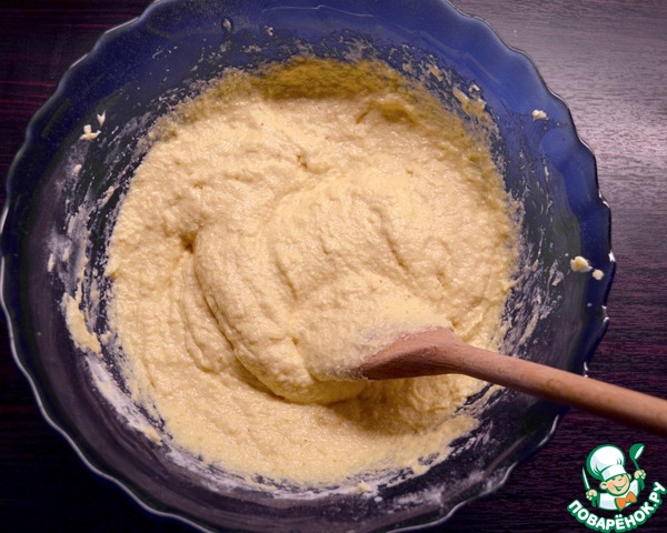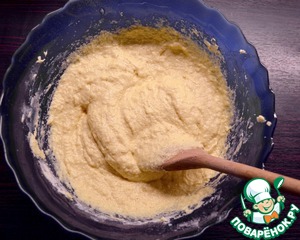 Масло взбить с помощью миксера до пышного состояния. Не переставая взбивать, ввести по одному яйца... Соединить обе смеси и влить молоко. Как следует всё перемешать.