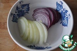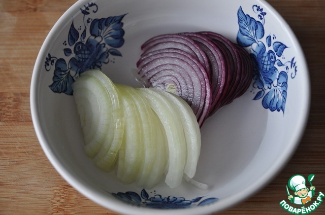 Красный и репчатый лук нарезаем тонкими полукольцами. Делаем маринад из тёплой кипячёной воды, сахара, соли и уксуса. Заливаем лук маринадом, отставляем в сторону.