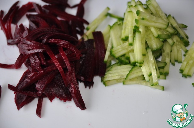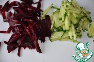 Варёную свёклу и огурец нарезаем (или натираем) тонкими полосками.