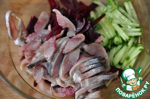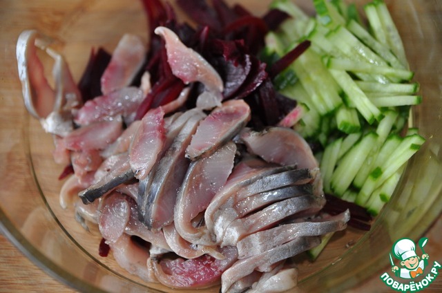 Малосольную сельдь чистим, разделываем на филе, режем тонкими полосками, добавляем к свекле и огурцам.