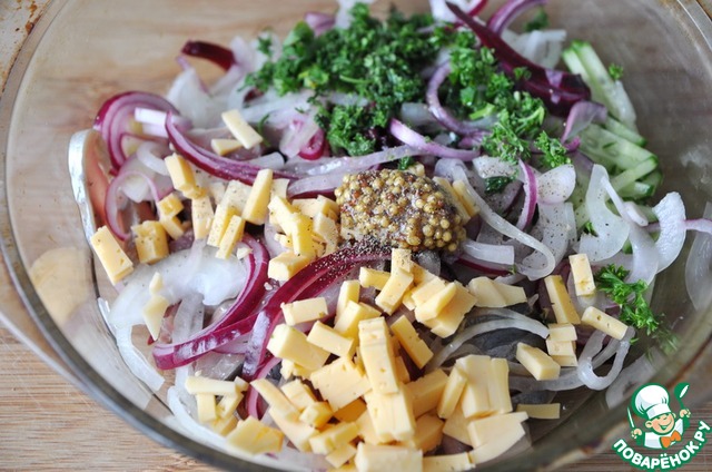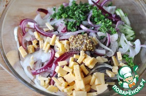 Маринованный лук слегка отжимаем. Сыр режем маленькими кубиками, мелко рубим петрушку. Соединяем все составляющие, добавляем свежемолотую смесь перцев, горчицу и растительное масло.