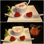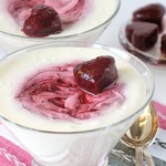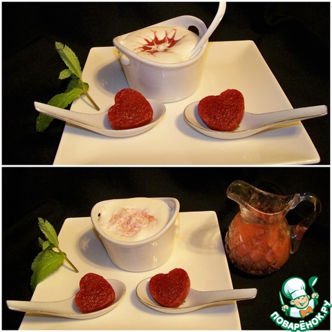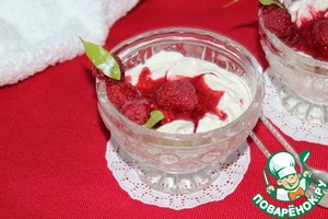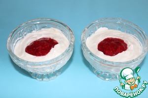 Разложите по креманкам или бокалам, сделайте чайной ложкой небольшое углубление, аккуратно положите малиновое пюре, шпажкой или лучиной размешайте пюре, опустив ее вниз до дна.