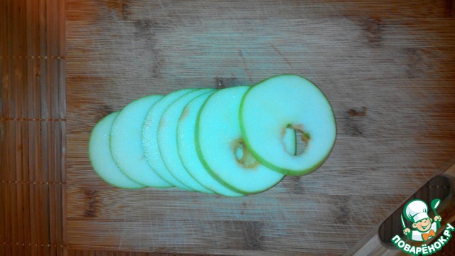 • У яблока удаляем сердцевину и тоже режем кружочками по 3-5 мм. ( В процессе приготовления пришли "два голодных мышонка" и стащили яблоки, пришлось взять другие)