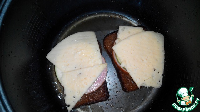• Дальше все делаем быстро, переворачиваем хлеб, кладем сверху ветчину, потом яблоко, потом сыр, и закрываем нашу мультиварку (сковороду) крышкой