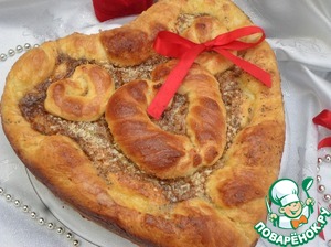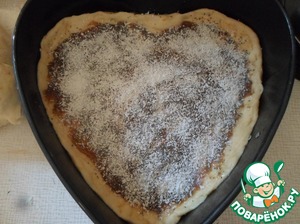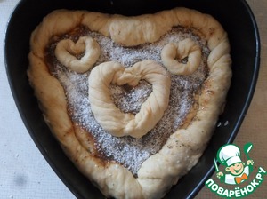 Из 2 части теста делаем сердечки выкладываем на начинку (можно просто полностью закрыть оставшимся тестом, тогда получится закрытый пирог).