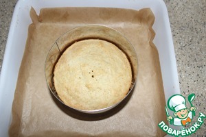 Форму для запекания выложила бумагой, сверху сервировочное кольцо, в него тесто. Выпекала в предварительно разогретой до 180 град. духовке 20 - 25 минут. Кольцо диаметром 12 см, высотой - 6 см.