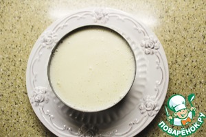На бисквитный корж вновь надела сервировочное кольцо и залила кремом. Поставила в холодильник (у меня застыл крем через 30 минут).