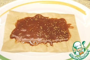 Размазала карамель на листе пекарской бумаги и отправила в холодильник, ускорять процесс застывания.
