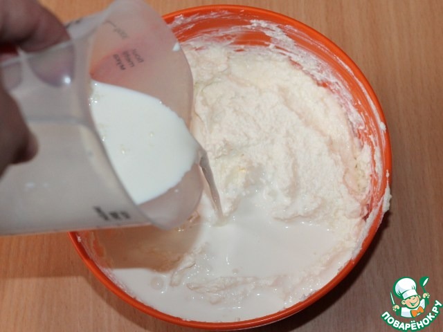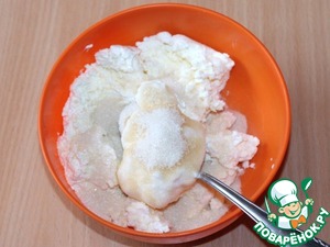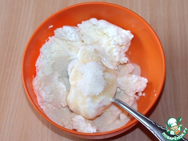 1. Творог взбейте с сахаром (2 ст. л.) и сметаной (2 ст. л.) до однородного состояния.