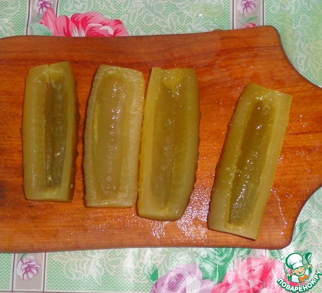 Соленые огурцы разрезать вдоль на две части. Аккуратно маленькой ложечкой выбрать мякоть с семенами.