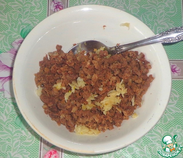 Очистить чеснок и натереть на мелкой терке. Высыпать чеснок к печени и сердечкам, перемешать.