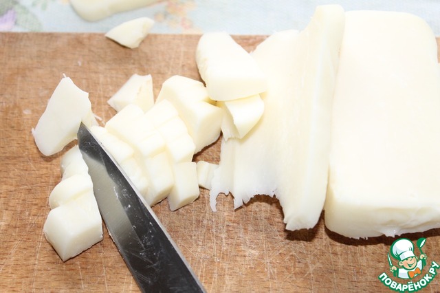 Режем сыр пополам. Сначала сделаем одну половину потом другую. Режем кубиками. -