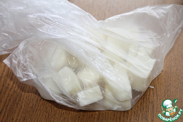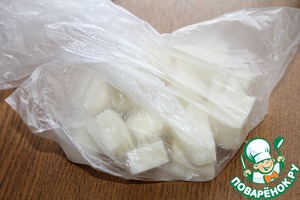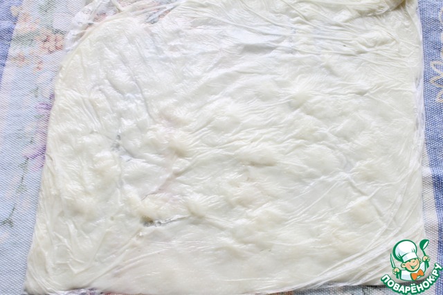 Выкладываем сыр на полотенце в пакете и разравниваем руками пласт. Кладем его в холодильник застывать и делаем вторую половину так же.