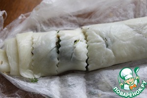 Достаем сыр освобождаем от пакета. Посыпаем сверху рубленными орехами, зеленью, чесноком, солим, перчим и заворачиваем рулет. И убираем в холодильник на 30 минут.