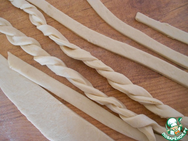 Вторую часть теста тоже раскатать и нарезать на полоски шириной по 1,5 см. Соединить по 2 штуки в косички-жгутики.