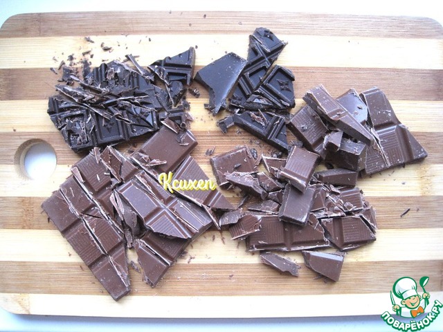 Шоколад порубим ножом. Я взяла часть молочного шоколада, часть горького шоколада.