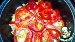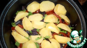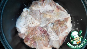 Описывать как и что резать не вижу смысла, это будет видно в процессе укладки продуктов в чашу мультиварки. Итак, первый слой - курица, солим и перчим по вкусу, и присыпаем смесью зиры и кориандра.