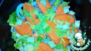 Морковь, режем кружочками по диагонали, и тоже в чашу её, а к ней добавим рубленые стебли сельдерея.