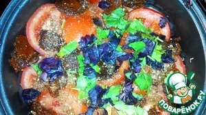 Очередь за помидорами. Я решил добавить и свежие и вяленые, еще раз оговорюсь, вяленые помидоры у меня собственного изготовления, посему не такие "запредельнодорогущие", как в супермаркетах. А значит "могем" ради такого случая добавить, аж, треть банки. Присыпаем оставшейся зирой и кориандром, а так же зеленью кинзы и базилика.