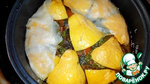В довершение всего, укрываем айву листьями капусты. Закрываем крышку мультиварки. Включаем режим "Мультиповар 160 град." на 15 минут. После окончания режима, НЕ ОТКРЫВАЯ КРЫШКИ!!!, включаем режим "Тушение" 1 час 45 минут. И забываем, хотя, уверяю вас, забыть о том, что у вас готовится, вам не позволит запах распространяющийся по кухне и квартире.