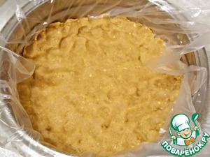 Сначала делаем основу для торта. Для этого мы измельчаем в крошку печенье и соединяем до однородной массы с маслом. Форму застелить полиэтиленовой пленкой (для удобства, когда буем вынимать). Утромбовать нашу массу по дну формы и поставить в холодильник для застывания.