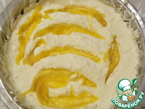 Отдельно взбить сливки и аккуратно перемешать. Выложить на застывшую основу. Сверху уложить дольки манго, утопить их и разровнять верх.