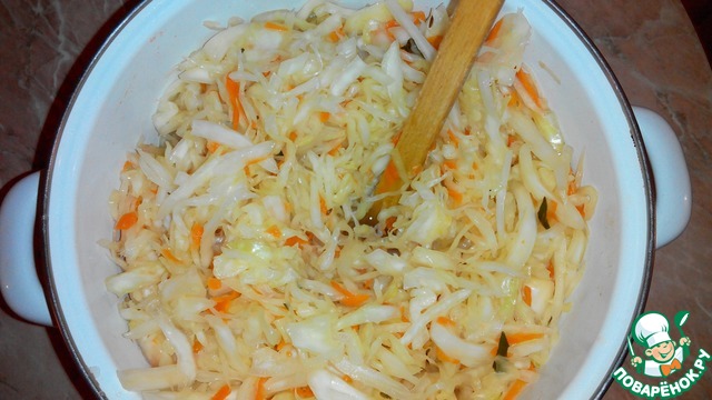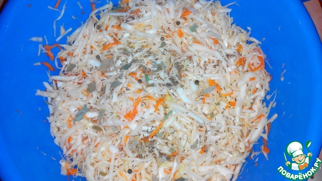 Вообще я считаю, что квашение капусты исключительно МУЖСКОЕ занятие, ибо разве сможет женщина умять такое количество капусты и потом впихнуть ее в 5 литровую кастрюлю? Короче мнем капусту, заодно перемешивая ее, добиваясь равномерного распределения моркови. Добавляем специи, тмин, душистый перчик и лаврушку. Лавровый лист предварительно растираем в руках. И снова мнем и перемешиваем, чем больше выжмем из капусты сока, тем лучше, так что не филоньте, мужики!