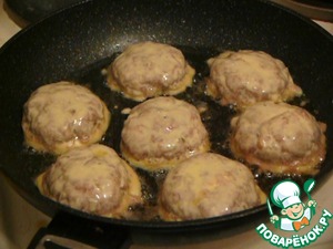 Ложкой набрать небольшое количество фарша и сделать лепёшку. В середину фарша положить небольшой кусочек сливочного масла и защепить фарш таким образом, чтобы масло оказалось внутри котлеты. "Искупать" котлеты в кляре и обжарить на медленном огне с обеих сторон