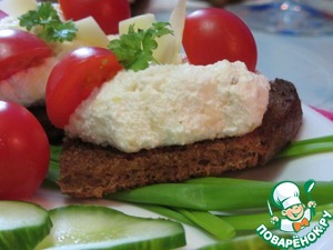 Мокрыми руками формируем творожный шарик и выкладываем на скибку, помидор разрезаем на две части и вкладываем на творог. Украшаем кусочками сыра и петрушкой!