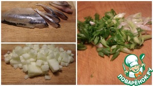 Нарезаем рыбное филе ломтиками, яблоко - мелкими кубиками. Мелко нарезаем зеленый лук. Очищаем яйца и нарезаем вдоль на 8 частей.