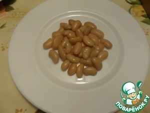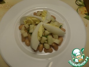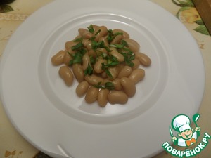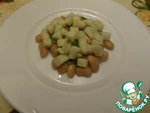 Приступаем к сборке салата. (Мы с дочкой делали порционно). На тарелку выкладываем фасоль.