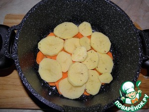 Далее на морковь выложить нарезанный картофель (специи).