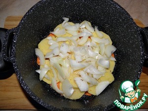 Далее, на картофель выложить произвольно нарезанный лук.