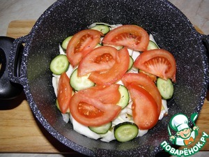 Далее на огурцы выкладываем помидоры ( про специи не забываем).