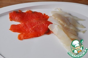 Лосось (у меня нерка) и палтус режем тонкими слайсами. Лучше использовать ломтерезку.