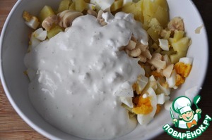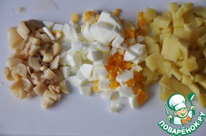Берём маринованные шампиньоны, варёное яйцо, картофель отваренный в "мундире". Чистим, режем кубиками.