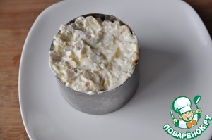 Для эстетичности порционной подачи берём тарелку, кладём кулинарное кольцо. Кладём в неё салат. Слегка прижимаем "толкушкой", снимаем кольцо.