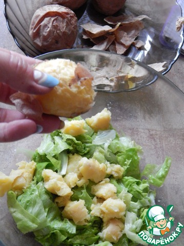 Картофель я запекаю в микроволновке-он получается не водянистым, мягкой структуры и его удобно нарвать кусочками (мне больше нравится так, чем резать кубиками).
