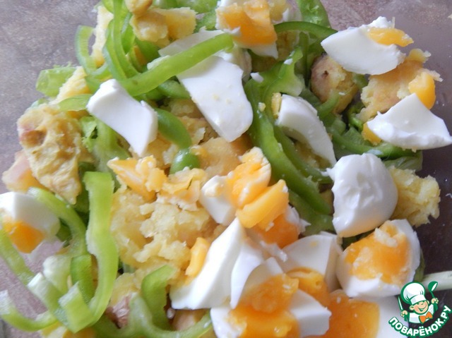 Отваренные яйца крупно нарезать и соединить с салатом.