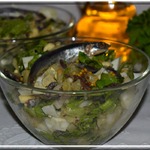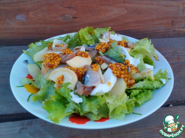 Да и я не откажусь)))Очень вкусно печёный картофель, яйца, килька, всё в дижонской горчице и приправлено листьями салата и перцем-прекрасный сбалансированный вкус этого салата делает его желанным гостем на столе.