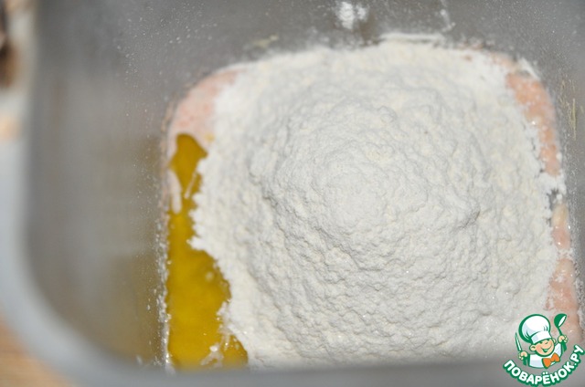 50 мл тёплого молока, 50 гр сахара и 50 гр муки смешиваем с дрожжами в ведёрке хлебопечи. Смесь разбалтываем и даём постоять 10 минут. -