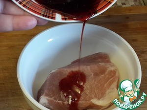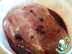Кусок свинины натрите солью со всех сторон, оставьте на 1 час, затем влейте к мясу маринад.