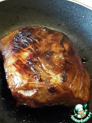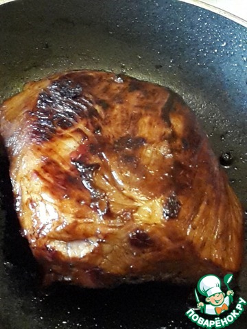 Выньте мясо из маринада (сохранив его). Разогрейте на сковороде масло и обжарьте на сильном огне кусок мяса со всех сторон.