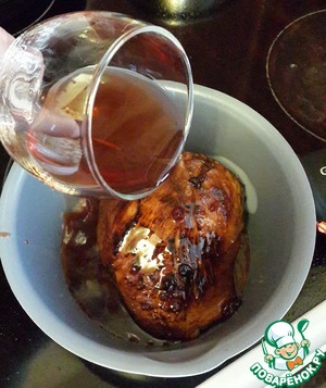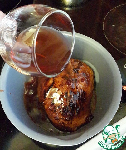 Переложите мясо в сотейник, влейте вино (я использовала смородиновое вино, но можно и виноградное), влейте остатки маринада и томите мясо под крышкой 40 минут. Остудите под крышкой, не вынимая из соуса.
